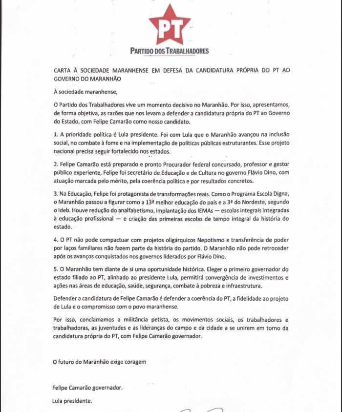 Defender a candidatura de Felipe Camarão é defender a coerência do PT, a fidelidade ao projeto de Lula e o compromisso com o povo maranhense. Por isso, conclamamos a militância petista, os movimentos sociais, os trabalhadores e trabalhadoras, as juventudes e as lideranças do campo e da cidade a se unirem em torno da candidatura própria do PT, com Felipe Camarão governador.