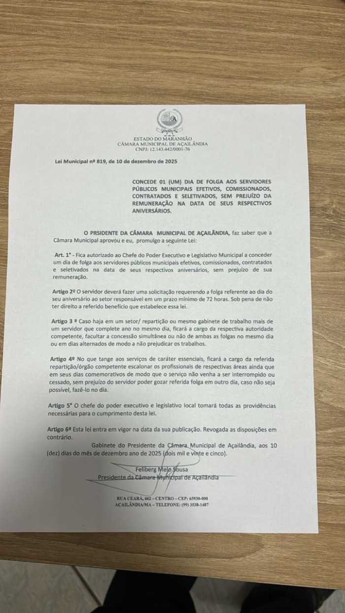 O vereador Dr. Rodrigo mostra mais uma vez compromisso com o servidor público municipal. Foi aprovada e promulgada a Lei Municipal nº 819/2025, que garante um dia de folga no aniversário para os servidores de Açailândia, sem prejuízo da remuneração.