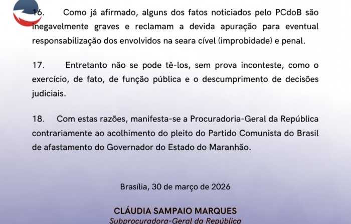 Em um capítulo decisivo para o xadrez político maranhense, a Procuradoria-Geral da República (PGR) manifestou-se, nesta segunda-feira (30), contrária ao pedido de afastamento do governador Carlos Brandão.